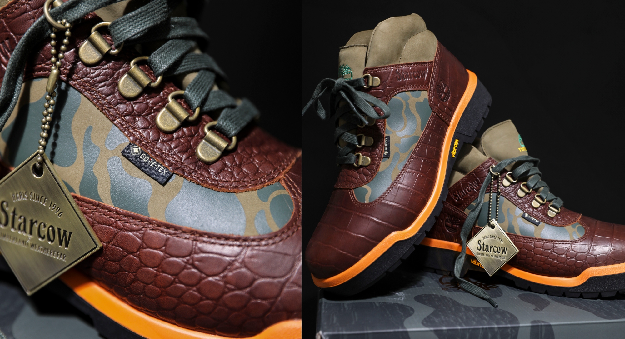 The design of the Timberland x Starcow Field Boot is a masterclass in textural storytelling. The Field Boot itself, often colloquially referred to as the "Sneaker Boot" due to its lighter weight and more flexible construction compared to the iconic 6-Inch Yellow Boot, has always been a favorite among those who require agility without sacrificing protection. For this iteration, Starcow has elevated the silhouette with a sophisticated "milk chocolate" brown leather that features a bold crocodile-skin texture. This choice of material instantly signals a shift toward luxury, bridging the gap between the construction site and the high-fashion runway. The rich, deep tones of the leather are contrasted by heavy-duty camouflage textile panels, a nod to the military-surplus aesthetic that dominated the 1990s street scene. Every detail has been considered, down to the antique brass metal hangtag that proudly displays the Starcow logo, serving as a stamp of approval from the Parisian tastemakers.