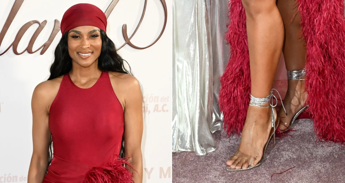Technical details of the footwear further highlighted Ciara’s penchant for "subtle spin" styling. The sandals were secured by thin metallic ties that wrapped high around the ankle, a design choice that draws the eye upward and emphasizes the length of the leg—a classic red-carpet trick executed here with contemporary flair. The backless shape was supported by a slim, towering stiletto heel, ensuring the silhouette remained light and airy. By combining the transparent strap with a mirrored metallic base, the design avoided the "plastic" look sometimes associated with PVC footwear, instead reading as a piece of wearable jewelry.