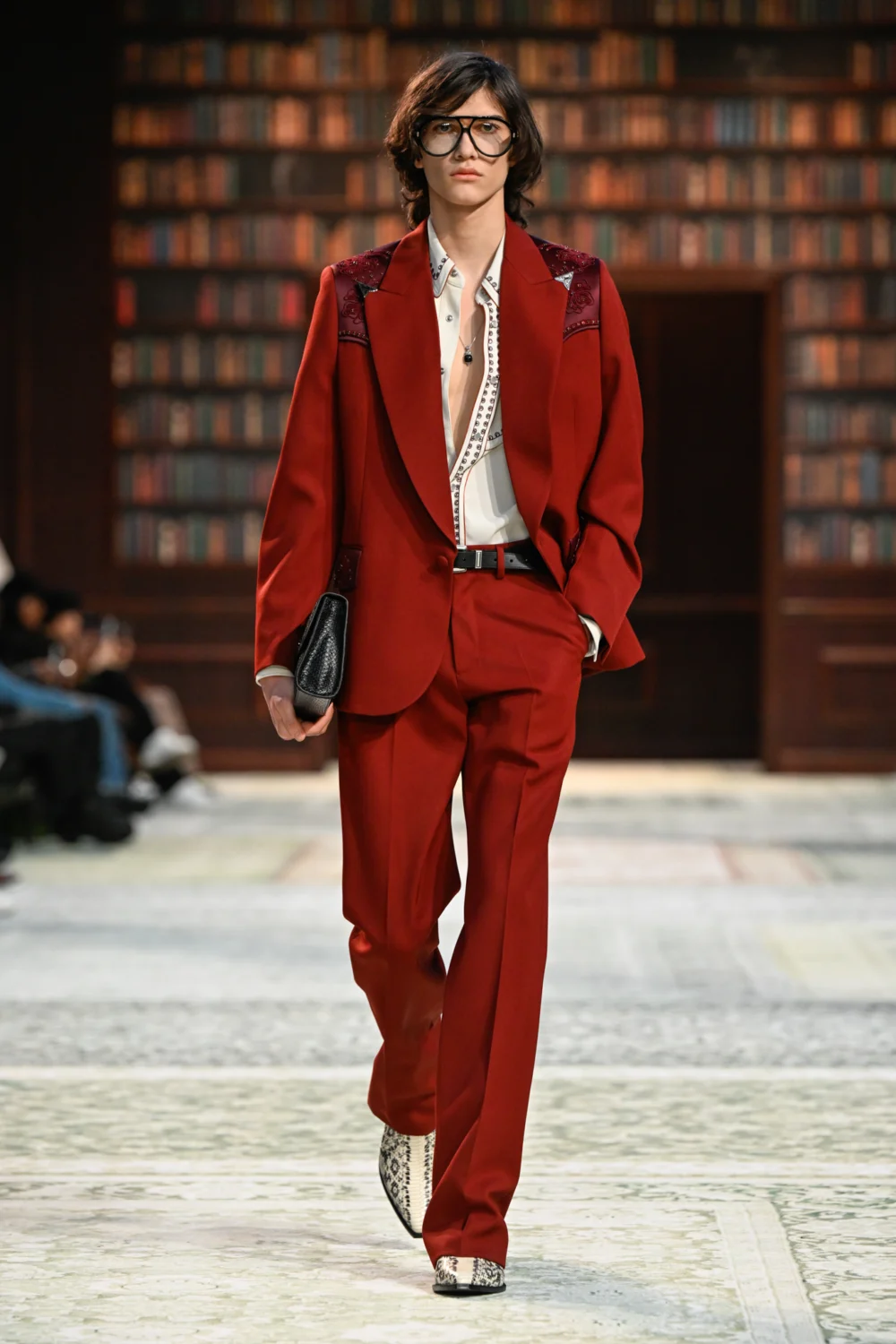 The color palette was intentionally bold, moving far beyond the muted tones typically associated with fall. Amiri employed eye-catching, saturated hues that spoke to the vibrancy of performance and the dramatic lighting of a nightclub stage. Deep vine green, dusty rose, and an electrifying seafoam green dominated the suiting, offering a visual jolt against the muted backdrop of the faux library. These tailored statements were invariably paired with highly polished, metallic cowboy boots—a final, decisive touch of rock-and-roll extravagance that grounded the collection in a narrative of amplified Americana.