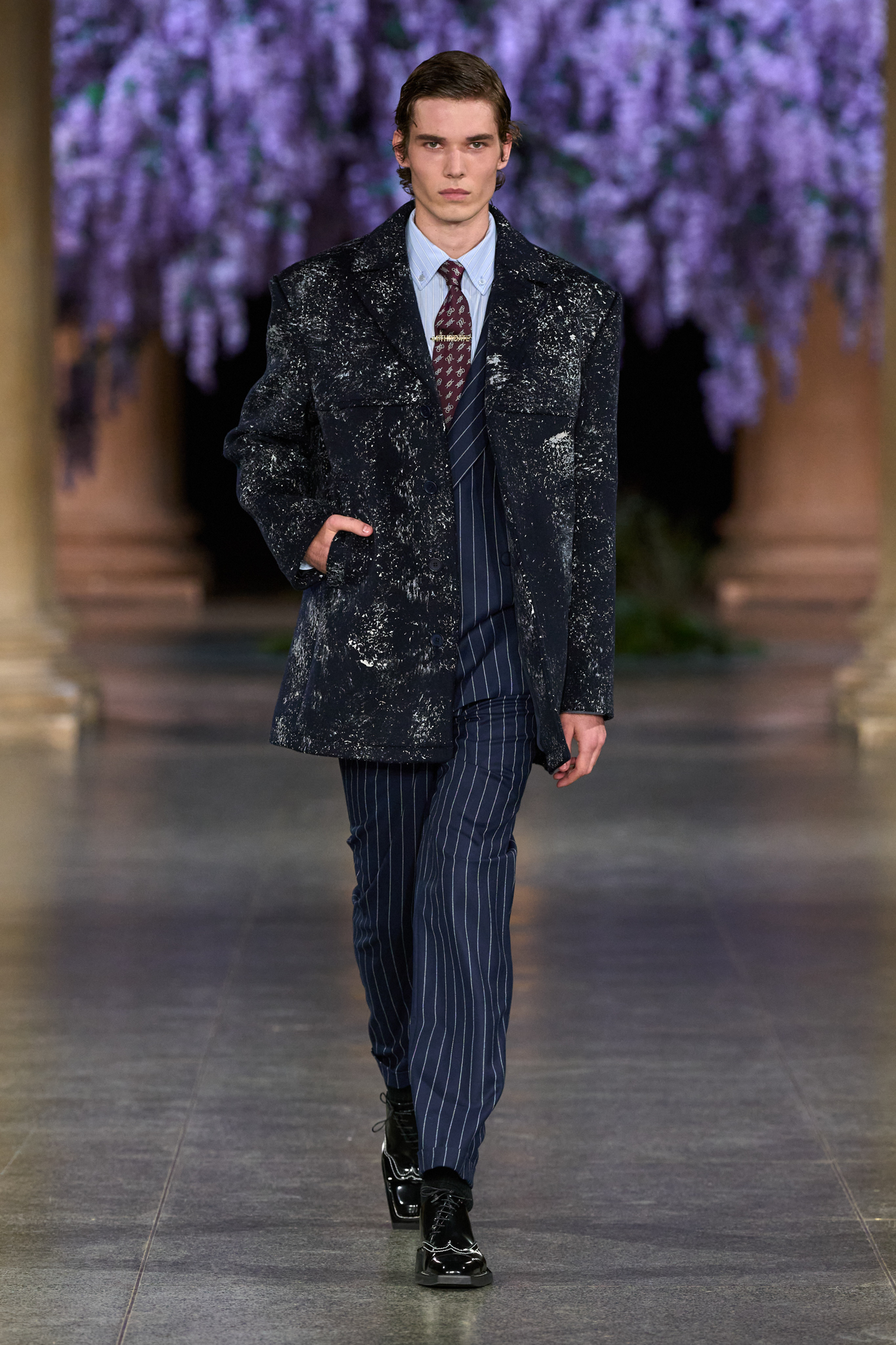 Finally, the collection arrived in the lush, tranquil surroundings of Richmond, where the recreational fisherman became an unlikely but compelling muse. This was perhaps the most inventive aspect of the show, as Fletcher integrated elements of fly-fishing gear into high-fashion silhouettes. Feathers were used not for mere decoration, but to mimic the intricate lures used by anglers, adding a tactile, organic dimension to the garments. The use of heavy-duty wools and technical fabrics suggested a rugged elegance, perfect for a weekend retreat from the city’s chaos. Duffle coats and pea coats—staples of the British maritime wardrobe—were updated with contemporary cuts and luxury finishes, ensuring they felt more like heirloom pieces than standard outerwear.