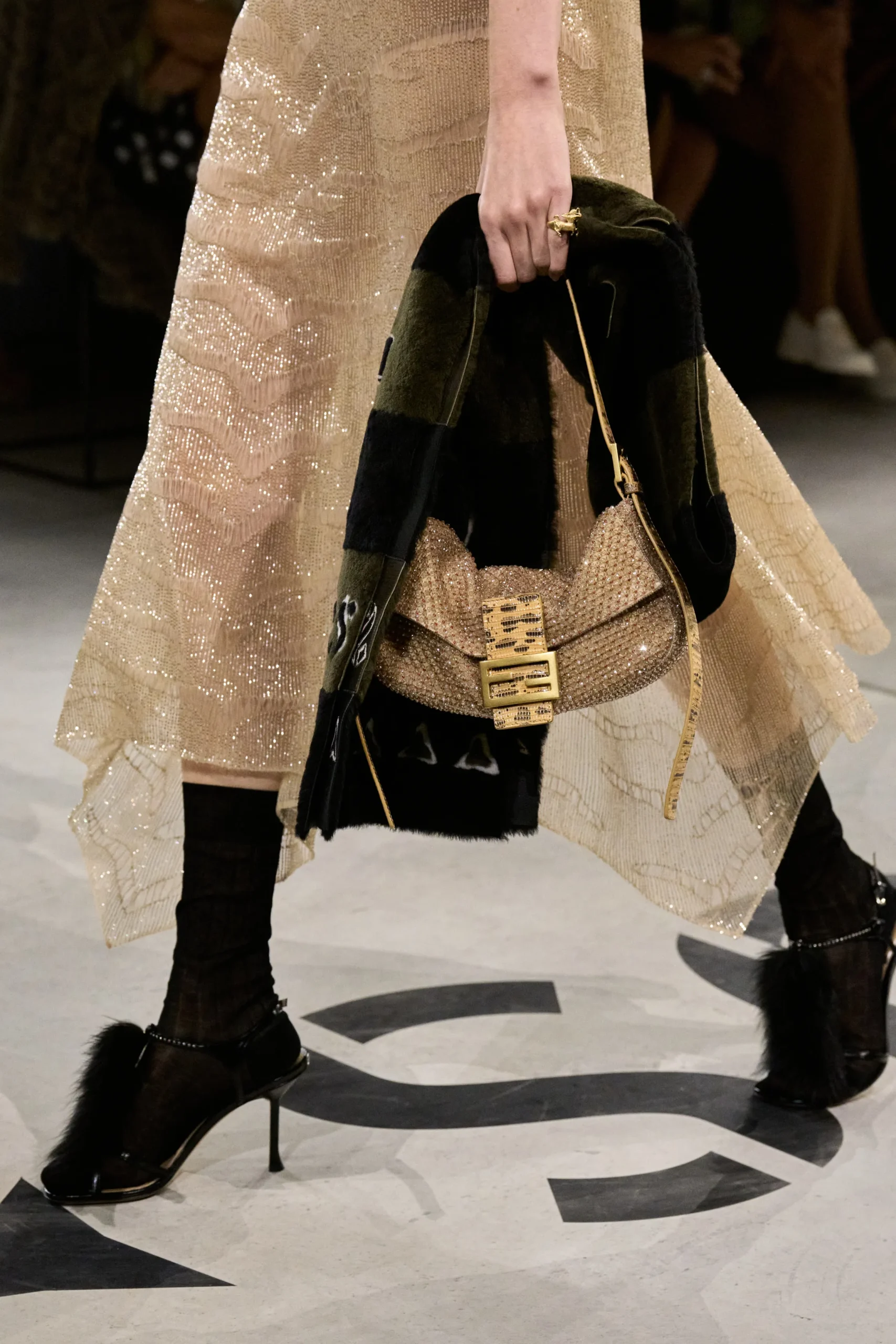 The Baguette was not merely present; it was celebrated in an astonishing array of interpretations, demonstrating the design’s supreme adaptability. Detailing ranged from rigorous, precise whipstitch leatherwork to lavish, eye-catching adornments. We saw iterations boasting intricate beadwork and shimmering crystal embellishments, while luxurious shearling added autumnal depth. The collection also heavily featured playful yet sophisticated animal prints. Leopard motifs were elevated with floral embroidery seamlessly inlaid into the pattern, and the zebra print received a glamorous update, accented with sequins and unexpected flashes of vibrant red bead trim along the edges.