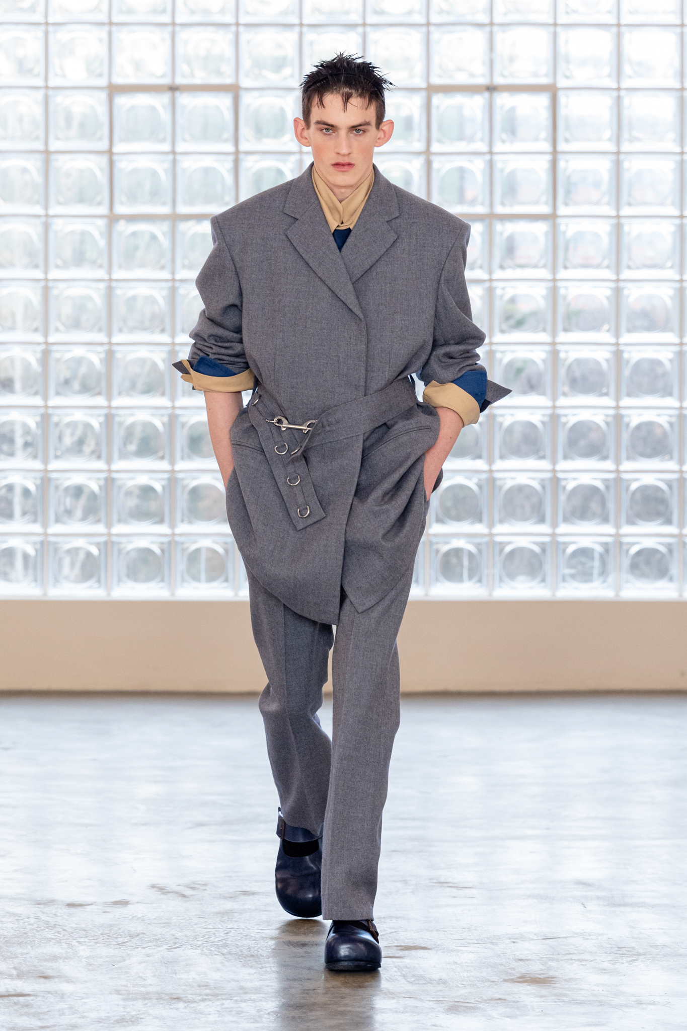 The resulting co-ed collection is a masterclass in controlled tension, juxtaposing the power of 1980s tailoring with the soft, almost floating quality of technical textiles. The ’80s whiff was unmistakable, particularly in the dramatically oversized shoulder proportions. This power silhouette—achieved through meticulous padding and cutting—was deployed across elongated blazer jackets and majestic long coats. Crucially, these pieces avoided feeling retro. They retained a modern relaxation, often tailored in soft wools or fluid blends that prevented the structure from becoming stiff or dated.