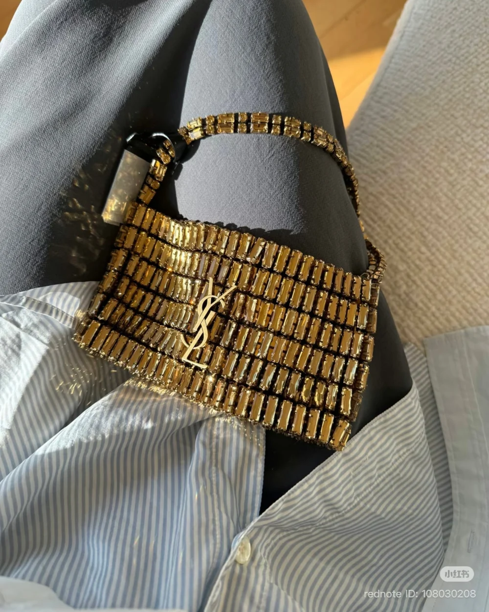 For those occasions where only maximal shimmer will do, the Saint Laurent Micro Evening Bag in Crystals is the answer. This is luxury distilled into its most concentrated form. This modern minaudière is entirely encrusted with meticulously embroidered crystals, ensuring it captures and refracts every stray light source. The centerpiece is the iconic, sharp-edged Cassandre motif, which sits proudly against the dazzling backdrop, making this tiny vessel an instant focal point for any evening attire.